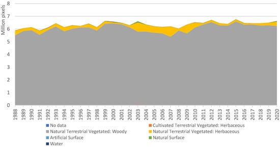 The DEA Land Cover product was chosen for comparison for several reasons: it was generated from the same annual Landsat geomedian data we used as input; it covered a similar range of years (1988–2020); and, importantly, it uses more conventional pixel-based machine learning methods, including Random Forests. The DEA Land Cover product was first converted to a simple land cover classification similar to ours (Table 3). The DEA Land Cover product uses the FAO Land Cover Classification System []. Simplifying its Level-4 classification enabled comparison to our land cover classes for each year from 1988–2020. It was not possible to separate the DEA class Natural Terrestrial Vegetated: Woody into our Forest and Plantation classes. Similarly, the DEA class Cultivated Terrestrial Vegetated covers both our Horticulture and Crop classes. Therefore, we amalgamated those classes for the comparison, yielding a simplified classification of six classes (plus No data for the remainder, see Table 3).