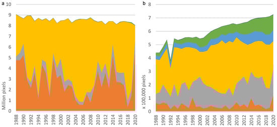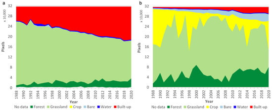 Distribution of land cover classes for 1988–2020 for simplified U-Net CNN model (a); and simplified DEA Land Cover (b) for Gungahlin area in Figure 11.