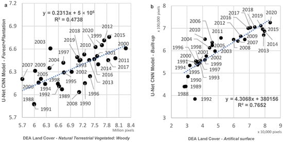Visually there is good spatial correspondence between simplified DEA Land Cover classes and U-Net CNN model results, particularly for the Forest, Water and Grassland classes (Figure 6). DEA Land Cover classes represented by each U-Net CNN model class are shown for Forest/Plantation (Figure 7), Grassland (Figure 8a) and Built-up (Figure 8b). For the U-Net CNN model Forest and Plantation classes, the vast majority of pixels from the simplified DEA Land Cover map are the class Natural Terrestrial Vegetated: Woody (Figure 7), with a gradual increase in the classes with trees from 1988–2020, and a correlation between trends in the respective classes of R2 = 0.47 (Figure 9a). In contrast, the agreement is not as close for the U-Net CNN model class Grassland. As expected, the majority of CNN grassland corresponds to the DEA class Natural Terrestrial Vegetated: Herbaceous (Figure 8a). However, there was also a considerable proportion (5–70%) of Cultivated Terrestrial Vegetated: Herbaceous and a smaller proportion (2–18%) of Natural Terrestrial Vegetated: Woody.