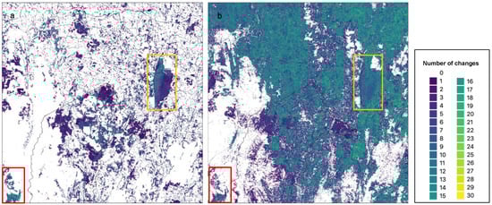 Total number of changes for simplified U-Net CNN model (a); maximum = 29, and simplified DEA Land Cover (b). Maximum = 30. Lake George (orange box) and southwest of tile (red box) highlighted.