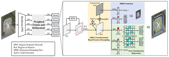 With the above analyses in mind, we argue that an effective detection model hinges on three aspects: feature enhancement, feature decoupling for classification and localization, and an appropriate bounding box regression scheme. In this article, we select the classical Faster R-CNN [6] as the basic detector, and propose three novel components to strengthen it. First, a weighted fusion and refinement (WFR) module accounts for feature enhancement. It adaptively weighs the multi-level features produced by FPN and leverages the attention mechanism [25,26,27,28] to refine the fused features. Second, a lightweight affine transformation-based feature decoupling (ATFD) module produces decoupled features for subsequent classification and localization. Third, a post-classification regression (PCR) module facilitates regressing quadrilateral bounding boxes. Given a predicted horizontal box, we discretize the regression range (i.e., box height or width) of each vertex into several bins and apply a simple classifier to predict which bin a vertex should belong to, so that only the vertex offsets with regard to corresponding ground truths need to be regressed.