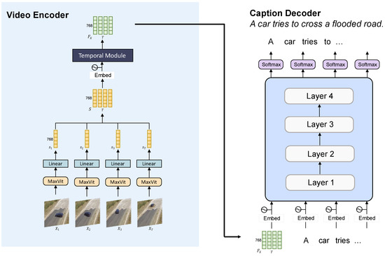 where . Thus, tokens are obtained from the video . These tokens are concatenated together with the global token generated by the TimeSformer encoder. The final representation is considered as the spatiotemporal feature representation of the input video , which is passed to the language decoder to generate the caption: