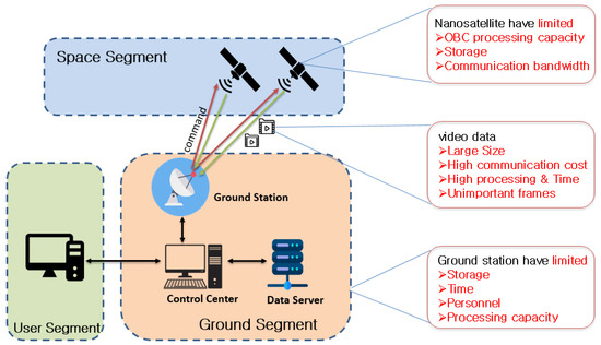 There will be several challenges when comparing video payload data to image payload data. Because video data is larger than image data, having high-resolution video data will necessitate more storage and communication costs (downloading bandwidth and time) to send all of the video data to the ground. Once the video data has been downloaded to the ground, it must be processed in a timely and efficient manner. Furthermore, the majority of the frames from the payload video data may be ineffective or irrelevant to the mission under consideration [5]. So, sending all the video data to the ground station without first analyzing and processing them will be costly. Figure 1 depicts the challenge of having a nanosatellite with a video payload.