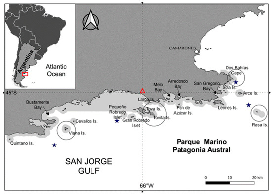 - Dans, S.L.; Cefarelli, A.O.; Galván, D.; Gongora, M.E.; Martos, P.; Varisco, M.M.A.; Alvarez Colombo, G.L.; Blanc, S.; Bos, P.; Bovcon, N.D.; et al. El golfo San Jorge como área prioritaria de investigación, manejo y conservación en el marco de la iniciativa Pampa Azul. Rev. Cienc. Investig. 2021, 71, 21–43. (In Spanish) [Google Scholar]