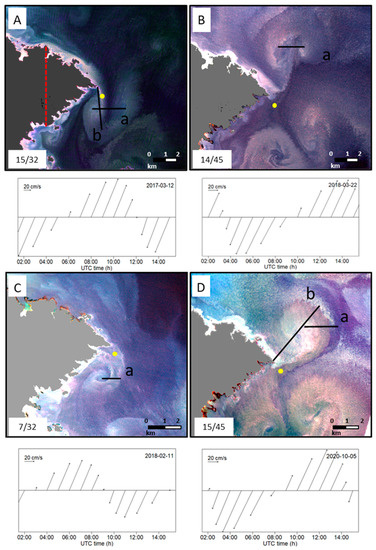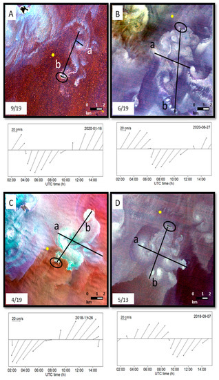 Structures in Rasa Island (inside the black circle). (A) Associated eddies chain north of Rasa Is., rotating clockwise, after 4 h of NNE tidal current. (B) Associated eddies chain south of Rasa Is., rotating clockwise, after 1 h of N tidal current. (C) Associated eddies chain north of Rasa Is., with both rotating directions, after 6 h of NE tidal current. (D) Associated eddies chain of Rasa Is., rotating clockwise, after 5 h of SW tidal current. Black lines indicate how the structures were measured, being (a) width of associated eddies chain and (b) distance from Rasa Island. Numbers in the lower left corner represent the number of scenes showing this particular structure (linked with Table 2). The arrow time series below each image represents the tidal current velocities 12 h prior to the acquisition of the image as extracted from TPXO data at the locations marked by yellow points in the corresponding image.