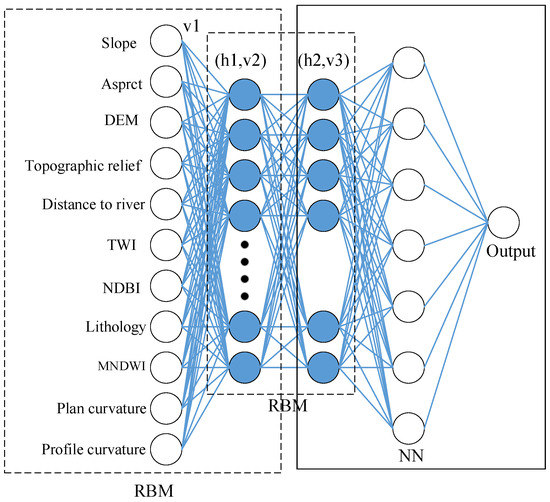 The study of artificial neural networks is where the idea of deep learning originated. To determine the distributed nature of data, it combines low-level elements to create a more abstract high-level representation (property class or attribute). An effective unsupervised learning algorithm is DBN. It has currently found widespread use in a variety of domains, including speech recognition and image categorization [52]. DBN (Figure 2) learns features from aspects that may be crucial to the incidence of landslides, which is a substantial advantage in creating landslide sensitivity zoning maps. Researchers often employ the 11 danger factors discussed in this study; however, it is challenging to understand and quantify these elements’ intricate linkages and intrinsic relationships. The original features of the elements are heavily relied upon in traditional network training techniques such as backpropagation BPNN and radial basis function (RBF), which are unable to disclose the combined impact of the components. DBN is thought to be a more effective solution in this situation. In light of this, this study tries to apply DBN to the Ruijin City landslide sensitivity zoning map.