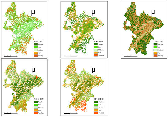 Taking the DBN model as an example, the mean size ranking of the susceptibility index under different AIN values is: Mean (4) > Mean (8) > Mean (12) > Mean (16) > Mean (20). The standard deviation size rankings are: Standard (20) > Standard (16) > Standard (12) > Standard (8) > Standard (4). From the above comparison, it can be seen that the mean value of the susceptibility index with an AIN value of 4 is the largest and shows a normal distribution, and the minimum standard deviation value indicates that the susceptibility index is mostly concentrated around the mean. With the gradual increase of AIN value, its mean gradually decreases, and the standard deviation value gradually increases. It can be seen that when the AIN value gradually increases, the landslide susceptibility index gradually approaches the distribution law of medium, low, and very low susceptibility intervals, and the distribution law of the susceptibility index is more scientific and reasonable. Combined with the prediction accuracy of susceptibility, DBN predicts more landslides with fewer high- and extremely high-prone areas in the process of increasing AIN value, which has higher prediction performance. However, acquiring accurate landslide environmental variables is a requirement for carrying out landslide susceptibility prep work, merging landslide susceptibility prediction results and susceptibility index comprehensive analysis, and is a prerequisite for valid susceptibility results.