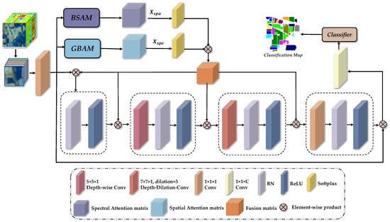 HSI typically has a large number of spectral bands, while not all of them are useful for classification. Thus, significant spectral bands should be highlighted for feature extraction. Inspired by the channel attention mechanism [], we regard spectral bands as the channels and develop a new band attention module (GBAM) for spectral feature learning. The structure of the proposed GBAM is shown in Figure 2.