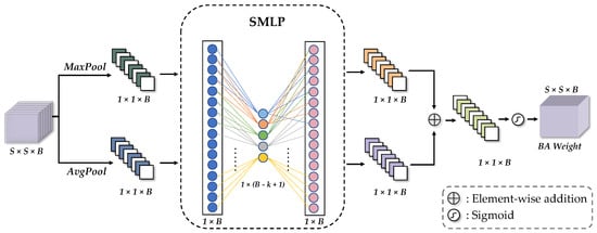 After and pass through the SMLP module, the element-wise addition operation and the sigmoid nonlinear activation function yield the band attention weight matrix . The band attention module can be expressed as: