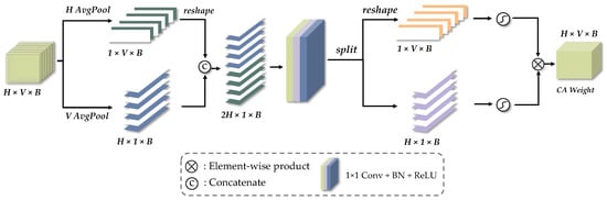 where denotes a convolution layer and denotes the concatenate operation. Then, the feature map is separated again into two tensor matrices, and , along the spatial horizontal and vertical directions, where needs to be reshaped back to its original shape. Then, and are delivered into the convolution layer with kernel and the sigmoid nonlinear activation function, respectively, making the shape of the output tensor matrix the same as the input data patch .