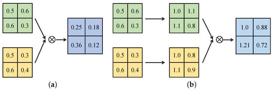 MAFB designs a new multi-attention fusion strategy. The attention weight matrices and learned from 1D-GBAM and 2D-BSAM branches help the network be more attentive to the channels and locations contributing to the feature classification task. However, there are some issues with fusing two attention and convolutional operations by the simple multiplication strategy. As is shown in Figure 4a, the weight values of and are in , which leads to a smaller value after they multiply. This may exacerbate the feature intensity to decay and lose the most critical information when using the simple multiplication strategy. Thus, we introduce a softplus-post multiplication in MAFB, as is shown in Figure 4b. Before multiplying the two weight matrices by the input map , the softplus activation function performs feature enhancement and linear activation on the weight matrices, respectively. By doing so, the weights between different features can be scaled up to avoid feature dissipation while the relative sizes are guaranteed to be constant.