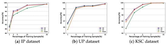 To further analyze the effect of the number of training samples on the proposed AETF-Net, we split the three datasets into a training set, a validation set, and a test set with varying proportions. The size of the validation set is always consistent with that of the train set, while the remaining portion constitutes the test set. The remaining hyperparameters were set to be consistent with the above. For the IP dataset, the number of training samples varies from 1%, 3%, 5%, 10%, and 20% of the dataset samples. For the UP and KSC, the number of training samples varies from 1%, 3%, 5%, 7%, and 10% of the dataset samples, respectively. The validation sets in the above three datasets are divided from the remaining data into data samples the same size as the divided training set, while the remaining part is employed as the test set.