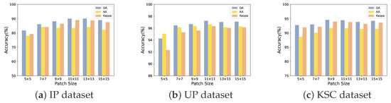 In this section, we design several experiments based on the dataset partitioning method and parameter settings described above to analyze the effect of the patch size on the proposed method. Figure 6 shows the classification results of the proposed method with different patch sizes. The OA has achieved 80% when the patch size is 5 × 5 for the IP dataset. As the value of patch size increases, the OA gradually improves and plateaus until the OA tends to 90% when the sample block size exceeds 13 × 13. For the KSC dataset, the OA decreases when the patch size increases to a certain sample block size. The reason is that the objects in KSC are small and in dispersed distribution, so the large patch contains multiple classes, which provide negative information for classifying the center pixel in the patch. Thus, considering the computational cost and HSI scene, we set the patch size to 11 × 11 in our experiments.