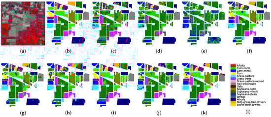 Furthermore, when viewed in the context of the proposed method, the standard deviation of the results of ten runs for almost every class and OA, AA, and Kappa is lower than that of the other methods. It can be demonstrated that the proposed method produces less variation and more stable results for small samples of different datasets, implying that the method is more robust and can be adapted for a broader range of hyperspectral datasets.