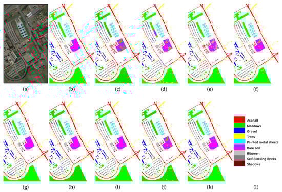 Classification maps of different methods on the UP dataset. (a) False-color; (b) Ground truth map; (c) 2D-CNN; (d) 3D-CNN; (e) Res-Net; (f) SSRN; (g) A2S2K; (h) MAFN; (i) DBDA; (j) A-SPN; (k) AETF-Net; (l) Color bar.