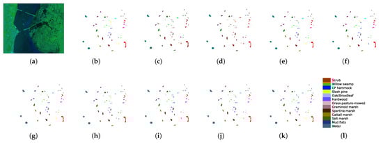 Classification maps of different methods on the KSC dataset. (a) False-color; (b) Ground truth map; (c) 2D-CNN; (d) 3D-CNN; (e) Res-Net; (f) SSRN; (g) A2S2K; (h) MAFN; (i) DBDA; (j) A-SPN; (k) AETF-Net; (l) Color bar.