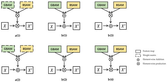 Six multi-attention fusion strategies are shown in Figure 10. They can mainly be split into two groups: attention weight fusion (Figure 10a) and attention feature map fusion (Figure 10b). The outputs of each attention module in attention weight fusion strategies are the combination of the weights, while the outputs of each attention module in attention feature maps fusion strategies are the combination of the weights and input maps. Especially the six multi-attention fusion strategies are designed as follows:
