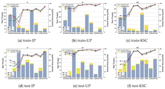 We computed the training and testing times of different methods using randomly selected samples. As shown in Figure 11, the proposed approach significantly improves training time compared to traditional DL methods. This is primarily attributed to the fact that traditional DL methods incorporate multiple convolutional and pooling layers in their network architecture to extract feature information, which leads to a large number of parameters when processing high-dimensional hyperspectral data. However, our proposed method did not show the least training and testing time compared to DL methods based on attention mechanisms, suggesting that further improvements are needed in our method. According to our model framework, it is possible that the increased computational cost of our method is due to the need for multiple information fusion processes in the backbone network. Nevertheless, our proposed method can fully extract and fuse the spatial and spectral features of HSI and the increase in computational cost is justifiable given the significant improvement in classification accuracy. The method A-SPN, which has the shortest processing time, may be attributed to its abandonment of the hierarchical structure composed of traditional convolution and pooling layers, resulting in a significant reduction in the computational cost of parameters. This is a direction worth exploring in our future work.
