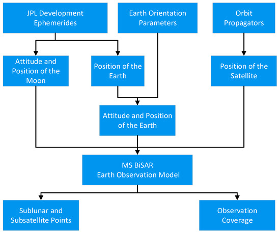 To quantify the geometric characteristics and coverage of MS-BiSAR Earth observation, it is necessary to establish precise geometric relationships between the Moon, the satellite, and Earth. This can be achieved by utilizing ephemeris and Earth orientation parameters (EOP) to determine the attitude and position of both celestial bodies. Subsequently, the positions of the satellites in the three orbits can be calculated using an orbit propagator. Once the attitude and position are transformed into a unified reference system, we can proceed with the quantitative analysis. Figure 2 illustrates the main workflow of this process.