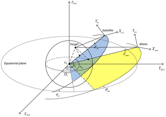The reference system comprises both coordinate and time systems. Therefore, in studying the geometric characteristics and coverage of MS-BiSAR, it is necessary to bring the Moon-based observatory, satellites, and Earth under a unified time system (UT1) and coordinate system (ITRS). Due to the abundance of reference materials available for time system transformations [23], this paper will not delve into them in detail; instead, this paper primarily focuses on coordinate system transformation.