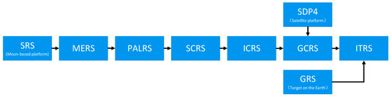Three types of reference systems are introduced in this paper. The first type is the geodetic reference system, used to describe the positions of Moon-based observatories on the Moon and targets on the Earth. The geographic reference system (GRS) and the selenographic reference system (SRS) are examples of such reference systems in this paper. The second type is a reference system dealing with the parameters related to the celestial body surface, its origin is defined at the center of the celestial body, and its X-axis lies at the intersection of latitude 0° and longitude 0° degrees on the celestial surface, with its basic plane in the celestial equatorial plane forming a right-handed coordinate system. In this paper, such reference systems include the mean Earth/polar axis reference system (MERS), the principal axis lunar reference system (PALRS), and the ITRS. The third type is the celestial reference system (CRS), with an origin at the center of the celestial body, and its fundamental plane being the mean equator plane containing the celestial’s center of epoch J2000.0. Its principal X-axis is pointing to the mean vernal equinox of epoch J2000.0. In this paper, the GCRS with an origin at the center of the Earth and the selenocentric celestial reference system (SCRS) with an origin at the center of the Moon are involved. While some papers describe the methods of reference system transformation in detail, this paper briefly introduces them [25,26]. Figure 4 shows the key reference system transformation processes involved in this paper.