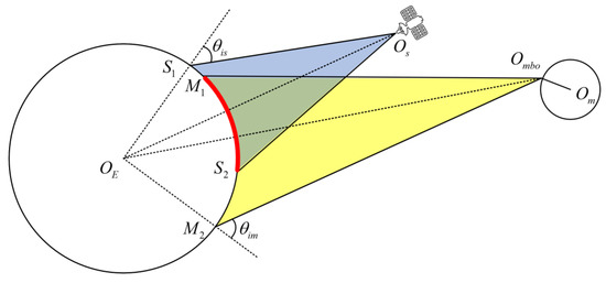 Simplified MS-BiSAR Earth observation geometrical model. is the Moon-based observatory, is the selenocenter, is the geocenter, and is the satellite. and are the threshold for the incidence angle of transmitter and receiver, respectively. and are the boundaries of the observable area of the satellite receiver. Meanwhile, and are the boundaries of the observable area of the Moon-based observatory. The red area is defined as the observable area of MS-BiSAR (not to scale for the sake of clarity).