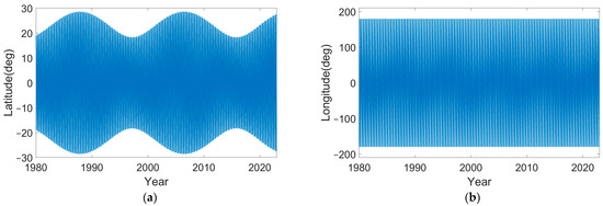 Figure 6 shows the latitude and longitude of the sublunar points at 00:00:00 daily from 1 January 1980 to 1 January 2023.