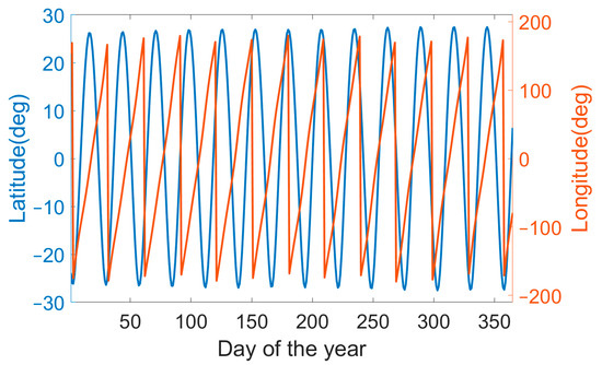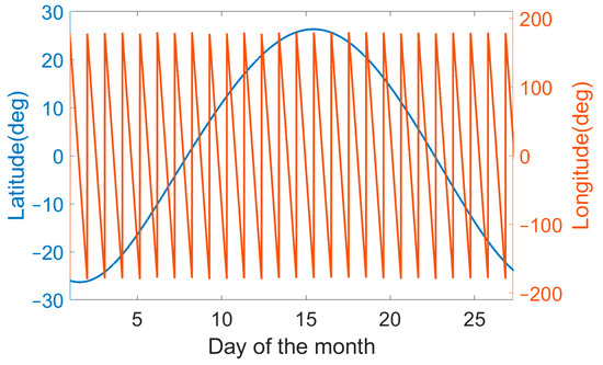 Then, the positions of sublunar points with time steps of 10 min were calculated from 1 January 2022 to 28 January 2022 (one sidereal month). As can be seen from Figure 8, in a sidereal month, the latitude of the sublunar points fluctuates once between the maximum and minimum values, and the longitude position of the sublunar point fluctuates between −180° and 180°, with a cycle of once per day. The latitude of the sublunar points has a significant sine wave period variation within one sidereal month, which also reflects the temporal coverage of Moon-based Earth observation in middle- and high-latitude regions. This is also a key factor that we focus on when analyzing the observational performance of Moon-based Earth observation.