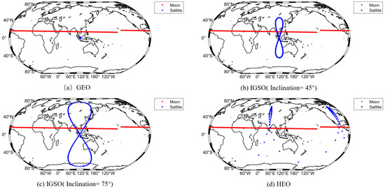 Since the period of GEO and IGSO is one day, while the HEO is half a day, we can select the nadir track of satellites with variant orbital parameters for analysis in one day. To clearly illustrate the tracks of subsatellite points, we have included them in the Robinson projection map. For comparison, we have also included the tracks of sublunar points.