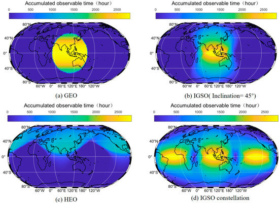 Figure 9 shows the subsatellite points of GSO with an orbital inclination of 0° (GEO), 45° (IGSO), 75° (IGSO), and HEO. The density of the points reflects the duration of time that the satellite stays above this area.