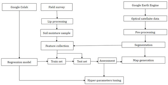 One of the prominent aspects of this study is that the SMC mapping is entirely based on free, open-source cloud computing platform resources provided by Google, including the Google Earth Engine (GEE) and Google Collaboratory (COLAB), ensuring full transparency and applicability to other regions. The COLAB programming environment is establishing itself as one of the most popular platforms for scientific computing. Furthermore, preprocessing steps such as simple noniterative clustering (SNIC) segmentation [30] are carried out within the GEE platform. A flowchart illustrating the steps for SMC prediction using satellite data is given in Figure 2. Other processing steps, including the regression analysis, hyperparameter tuning, etc., were realized within COLAB. Regarding the used satellite imagery, the multispectral bands recorded by each of the sensors L8 and S2 are given in Table 1.