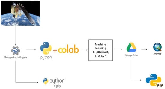 Google Earth Engine (GEE) is a planetary-scale web portal offered by Google. GEE uses Google’s cloud-based computing and approachable, open-access remote sensing datasets. GEE has the ability to provide and process big geodata that eases the scientific discovery process by giving users free access to large remotely sensed datasets [52]. The outstanding feature of this GEE is that it is free. It provides access to the databases of European and American space agencies, as well as other databases. For instance, regarding optical data, both raw radiance products and atmospherically corrected surface reflectance products are provided. At the same time, the Google Colaboratory (Colab) is a free cloud notebook environment that has free access and is automatically saved to Google Drive on graphics processing units (GPUs). The benefit is that COLAB can easily access GEE and supports a diversity of machine learning libraries, which can be quickly loaded into a notebook (Figure 3). Codes for the machine learning algorithms utilized in this paper are accessible at scikit-learn.org.