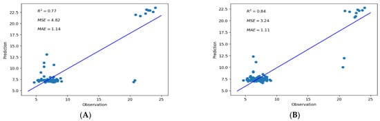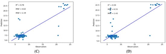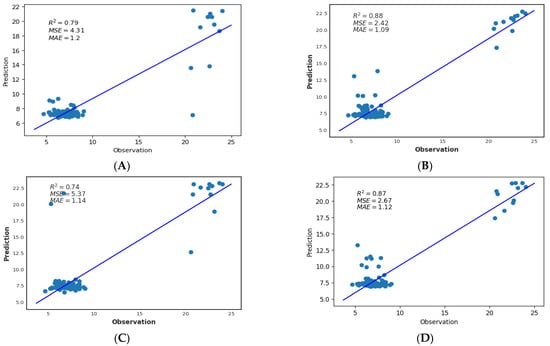 The RMSE and MAE values should be closer to zero for optimal prediction, and the R2 and NASH-Sutcliffe efficiency values should approach one. The NSE in theory differs in the range −∞ to 1, and higher values of the NSE illustrate well the agreement between predicted values and observations.