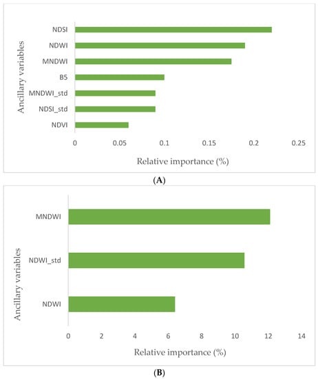 This research used the machine learning algorithms RF, SVR, ETD, and XGBoost to determine the importance of predictors and predict SMC content and reached the best performance in terms of model accuracy and spatial patterns. Our results revealed a close agreement between the RF and ETD models in estimating SMC. Earlier studies showed that RF models were acceptable compared to those from other models for testing datasets. So, RF was selected as a promising method to predict SMC [25]. The relatively good performance of EDT and RF models is in agreement with earlier studies that found decision-tree-based regression models outperformed other machine learning algorithms, particularly in terrain and soil spatial predictions [21,57]. A previous study demonstrated that due to the hydraulic behavior of water in unsaturated sand, a decrease in spectral reflectance occurs [58]. Soil reflectance correlates nonlinearly with SMC, which correlates well with a curved exponential model between 1100 and 2500 nm [16]. Even though green and red wavelengths have a nonlinear relationship with SMC, the Pearson correlation coefficient represents a fairly weak negative relationship between visible wavelengths and SMC. Several authors earlier studied relationship between optical remote sensing data and SMC with statistical analysis [25,31,59]. The studies reported that the RF process supplied the highest Nash–Sutcliffe efficiency value (0.73) for SMC retrieval covered by the various land-use types. Therefore, RF has been chosen as an excellent method to predict soil moisture [25]. Ref. [50] stated that RF is flexible and easy to use because only a few parameters need to be set by the user. The amount of surface soil moisture was evaluated using remote sensing data. Similarly, the results as reported in [60] showed that machine learning models such as RF, extended trees and SVR perform superior than neural network models, multiple linear regression and classification and regression trees. (CART). This issue is probably due to the optimization algorithms for the selected parameters having different accuracy for training the models. The superiority of RF and SVR over other models has also been reported in various studies [61,62]. In the results presented by [20], two developed tree algorithms and a RFt with a MAE value less than 4% of soil moisture had better performance, which is consistent with other studies, and underlines that regression models based on decision trees work better than other machine learning algorithms. Encouraging results were obtained for the possibility of estimating soil moisture with the research method. Indices (MNDWI, NDWI, NDVI, BT, and LST) were calculated with the help of a combination of two series of telemetry data, including SMOS microwave data and short infrared and near infrared data from the MODIS sensor, to estimate soil surface moisture in the region. The result of this study led to an acceptable relationship between SMC and remote sensing data [63]. The results of that research also indicate the effect of NDWI on the estimation of humidity from satellite data, which is comparable with the results of the research [63]. The results of this research confirm the possibility of using the reflection and thermal data of the L8 satellite as an indirect method with acceptable accuracy to estimate soil surface moisture and regular 16-day monitoring of this important hydrological parameter. The results agree with the findings of [64,65,66]. Higher values of the NDVI index indicate higher vegetation density [67,68]. The model XGBoost MNDWI is a more sensitive index than NDWI for estimating SMC, similar to results achieved in other studies [69]. Previous studies have shown that SMC has a positive and significant relationship with the NDVI index [70,71,72]. Ref. [73] stated that auxiliary data and optical data have a high impact on SMC estimation. optical remote sensing can only capture canopy reflectance and has limited ability to penetrate crops, which means that it obtains information on crops rather than soil in croplands. However, it is possible to estimate soil moisture from optical satellite imagery through the physical mechanism of vegetation response to soil moisture. Vegetation responds to changes in soil moisture by altering its biophysical properties, such as leaf area index, canopy cover, and vegetation water content. This leads to changes in the reflectance of different spectral bands captured by optical sensors. For instance, in the near-infrared (NIR) spectral region, vegetation reflectance decreases as soil moisture increases due to increased canopy cover and water absorption. Conversely, in the shortwave infrared (SWIR) spectral region, vegetation reflectance increases as soil moisture increases due to increased water content in the leaves. By using machine learning algorithms that take into account the relationships between vegetation biophysical properties and soil moisture, it is possible to estimate soil moisture from optical satellite imagery. However, it is important to note that the accuracy of these estimates may be affected by factors such as scan time, atmospheric conditions, and the type of vegetation and soil present in the study area. It is also worth mentioning the high impact of vegetation index from feature importance analysis. As mentioned in the paper, Section 2.2, the fields had sparse crop cover at the time of sampling, which might have lessened the impact of active evapotranspiration on the soil moisture retrievals. However, it is still important to note that acquisition time can affect the thermal equilibrium and therefore impact the accuracy of soil moisture retrievals, especially in areas with denser vegetation cover.