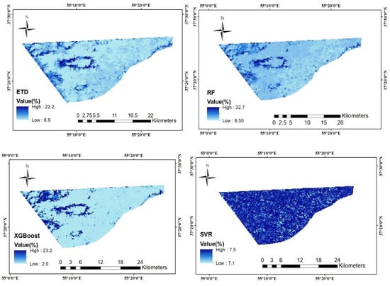 S2: Based on the evaluation of the results shown in Table 9, it can be observed that the ETD consistently outperformed all other models in estimating SMC, not only for L8 (RMSE = 2.42, RME = 1.08, R2 = 0.97–0.88), but also for S2 (RMSE = 3.24, RME = 1.11, R2 = 0.97–0.84). The RF (RMSE = 4.62, MAE 1.19, R2 = 0.78–0.91) ended up the second-best model for estimating SMC. The XGBoost model (RMSE = 8.55, MAE =1.43, R2 = 0.92–0.59) estimated that the SMC had a lower R2 than during the validation. In contrast, model SVR (RMSE = 4.82, MAE =1.14, R2 = 0.77–0.83) was more than the XGBoost model for estimated SMC in S2. The numerical value shows that the performed ETD regression can control the SMC data by estimating a valuable fitness standard. Based on the results, SMC was predicted with medium accuracy for the ETD (R2 = 0.88), whereas the XGBoost led to the poorest estimation accuracy. The SVR had a significant amount of R2, while the L8 had a smaller value.