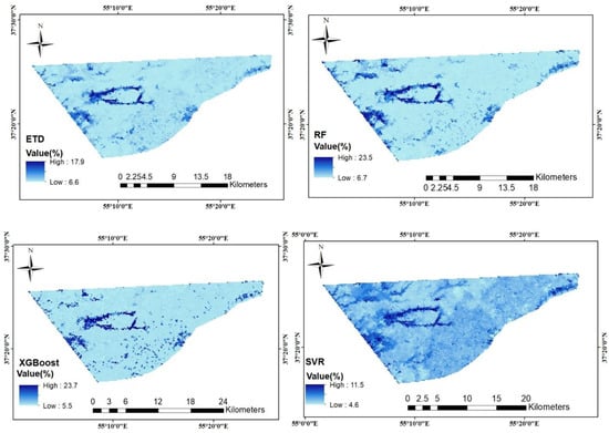 As shown in Table 8, four machine learning models for predicting the SMC without segmentation perform well in terms of evaluation metrics. In these statistical results, we presented the results of the RF, XGBoost, ETD, and SVR models for four input combinations in two datasets, L8 and S2. These results are briefly addressed below.