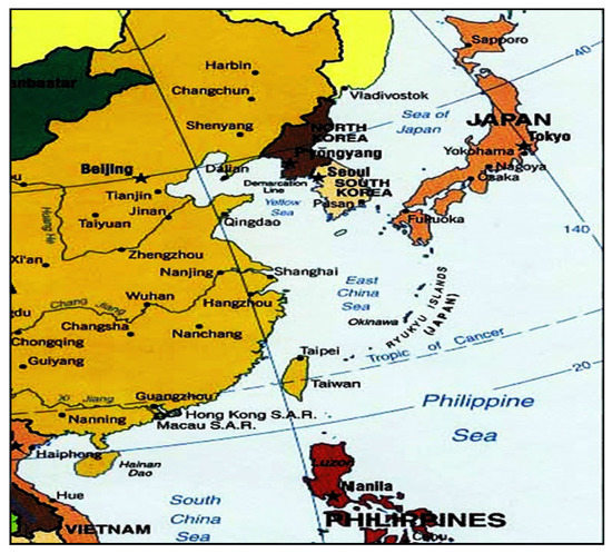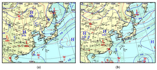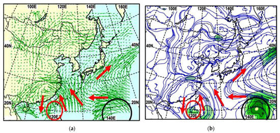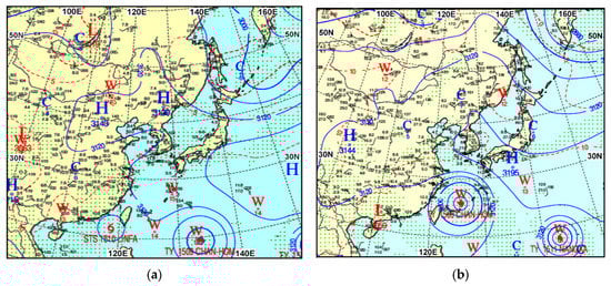 The study area in East Asia includes the South China Sea, the East China Sea, the Yellow Sea, the Sea of Japan/the East Sea, and the Western Pacific Ocean facing Vietnam, China, the Philippines, Korea, Japan, and Russia in Figure 1. More than thirty tropical cyclones passed by those seas from the early summer to the late fall and caused severe weather with heavy rainfall and strong gusts in southern and northeastern Asia. In those seas, tropical cyclones have normal or abnormal tracks in their routes, and mutual interactions between two or three typhoons and a mid-latitude high pressure occur frequently.