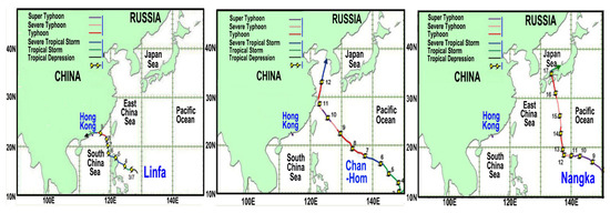 Typhoon tracks—STS Linfa, TY Chan-Hom, and TY Nagka (supplied by Hong Kong Observatory). Numbers (1 to 14) inside figures denote the day of July (https://www.hko.gov.hk/en/wxinfo/currwx/tc_gis.htm, assessed on 7 April 2015).