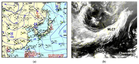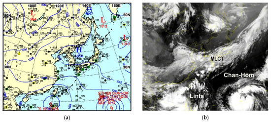 As shown in Figure 3, except for (a) surface pressure chart (hPa) and (b) COMS-IR satellite image, at 09:00 LST, 10 July 2015. STS Linfa’s circulation weakened to a low pressure (L; 1000 hPa, finally dissipating, because of its strong interaction with TY Chan-Hom and the friction of the inland and shallower sea depth.