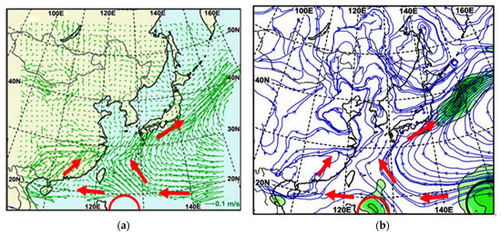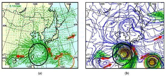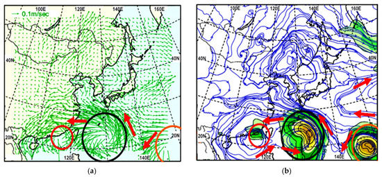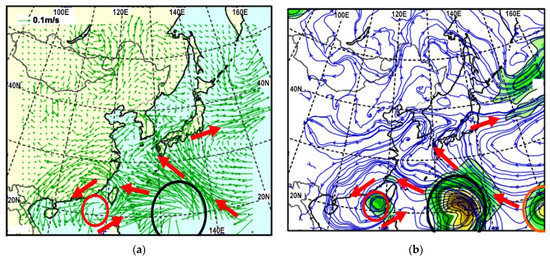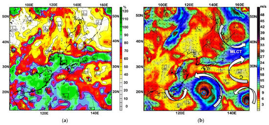 As shown in Figure 4, except for (a) moisture flux (0.1 kg·m/s) and (b) streamline with isotaches at 09:00 LST, 8 July. In (b), as STS Linfa (left) was strongly pulled by the more intensified TY Chan-Hom (center) by mutual interaction of the MLCT and TY Nangka (right), it kept the same central pressure and maximum wind speed.