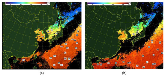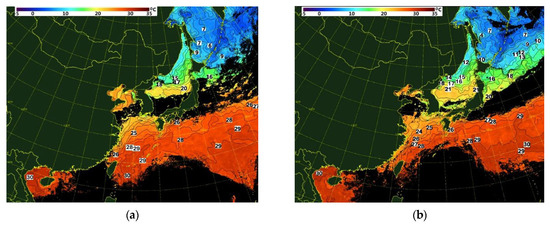 (a) Images taken at 09:00 LST, 8 July 2015, and (b) 09:00 LST, 9 July. Long black area oriented from southwest to northeast in (a,b) indicates the MLCT. STS Linfa moved to the warmest sea of 31 °C SST in the South China Sea passing Luzon Island in (a,b). TY Chan-Hom also moved over the Kuroshio current of 31 °C SST to the northeast of the Philippines, being closer to the MLCT.