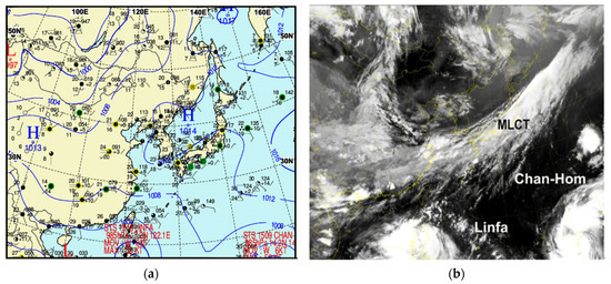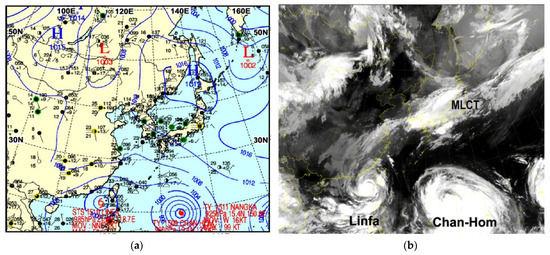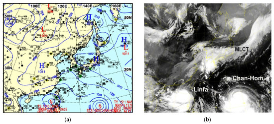 As shown in Figure 3, except for (a) surface pressure analysis (hPa) and (b) COMS-IR. satellite image at 09:00 LST, 6 July 2015. The multiple interactions between STS Linfa and TY Chan-Hom and between the MLTTC and TY Chan-Hom decreased the distance between them.
