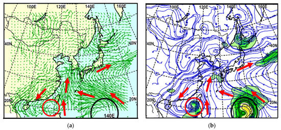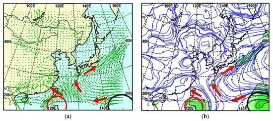 As shown in Figure 4, except for (a) moisture flux (0.1 kg·ms−1) and (b) streamline with isotachs at 09:00 LST, 5 July. As the MLCT steered both STS Linfa and TY Chan-Hom northward, their cyclonic circulations in their upper quadrants enabled intensification from the strong southwest wind produced by the MLCT, and the decreasing distance between them then enhanced the exchange of moisture.