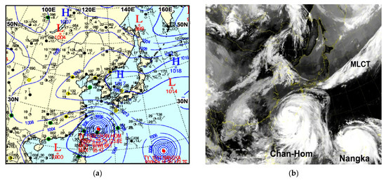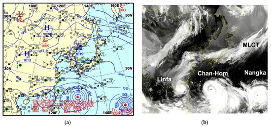 In July 2015, several tropical cyclones were detected every few days in the west Pacific Ocean. The Joint Typhoon Warning Center (JTWC) monitored a small tropical disturbance in the Inter-tropical Convergence Zone (ITCZ) on 25 June and issued a Tropical Cyclone Formation Alert for a low pressure located about 350 km northeast of Pohnpei Island, Micronesia, at 22:30 Universal Time Coordinated (UTC; for instance, 09:00 Korean Local Standard Time (09:00 LST) = 09 h + 00:00 UTC), on 29 June 2015 [26]. The JTWC and the Japan Meteorological Agency (JMA) upgraded this system to a tropical depression (TD) at 00:00 UTC, on 30 June. It was then upgraded to a tropical storm (TS) by JMA, later assigned the name, Chan-Hom (No. 1509), and upgraded again to a typhoon (TY) on 1 July (Figure 2).