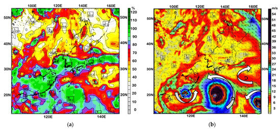 (a) Relative humidity (%) and (b) wind (m/s) at 1.5 km height (850 hPa) by WRF-3.6 model at 09:00 LST, 9 July 2015. The three typhoons’ steering as a result of multiple interactions among them (STS Linfa (bottom-left), TY Chan-Home (bottom-center), and TY Nangka (bottom-right)) cause their intensification and decay.