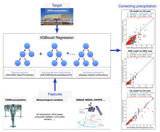 We aim to correct the T200B precipitation measurements using a machine learning method, in which relevant meteorological variables are selected (Figure 2). After selecting the key features (meteorological variables), the hyper-parameters were calibrated, and the machine learning method was trained to validate the performance of the precipitation correction. Remotely sensed precipitation was also incorporated into the machine learning method to explore whether the RS data can improve precipitation correction. Finally, after building and examining the machine-learning model at the Yakou station, we also examined the transferability of the machine-learning method to other sites worldwide, such as the United States and Norway.