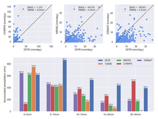 The comparison among remotely sensed precipitations and in situ DFIR observations. The upper subfigures are the scatter plots between the DFIR and the remotely sensed precipitations (CHIRPS, IMERG, and GSMaP). The lower bar graph compares precipitation datasets in different daily precipitation ranges from 0–5 mm/day to 20–40 mm/day. The precipitation values are labeled above each bar.