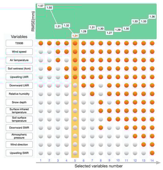 We found that increasing the number of variables did not necessarily lead to better training results. On the contrary, removing irrelevant variables led to better results, making the trained model more robust. Our machine-learning model was optimal with five variables, and the RMSE for the validation period was 1.24 mm. However, after adding variables such as downward longwave radiation, the model’s accuracy was not improved, and it was 1.28 mm. Although the change in accuracy due to the addition of variables was relatively small, it illustrated that adding variables of low importance or relevance did not improve the accuracy of the learning model.