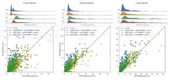 Regarding RMSE, the XGB method outperformed the T200B observation, particularly in the 6 h interval case, where XGB achieved an RMSE of 1.2 mm, half that of the T200B observation.