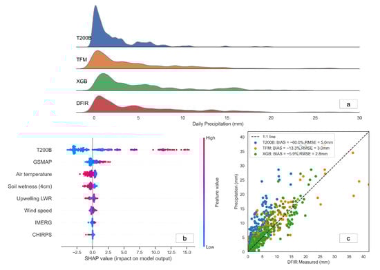 The corrected precipitation results by integrating the remotely sensed precipitation (GSMAP, IMERG, and CHIRPS). (a) The frequency distributions of precipitation datasets using the XGB and TFM methods of the T200B and the DFIR. (b) The importance of explanation using SHAP values. Each line in the graph represents a feature; the horizontal coordinates are SHAP values. A dot represents a sample. The redder the color, the larger the value of the feature itself. The bluer the color, the smaller the value of the feature itself. (c) The comparison between the corrected precipitation and the truth value using the DFIR observation. The accuracies (BIAS and RMSE) are listed in the upper left.